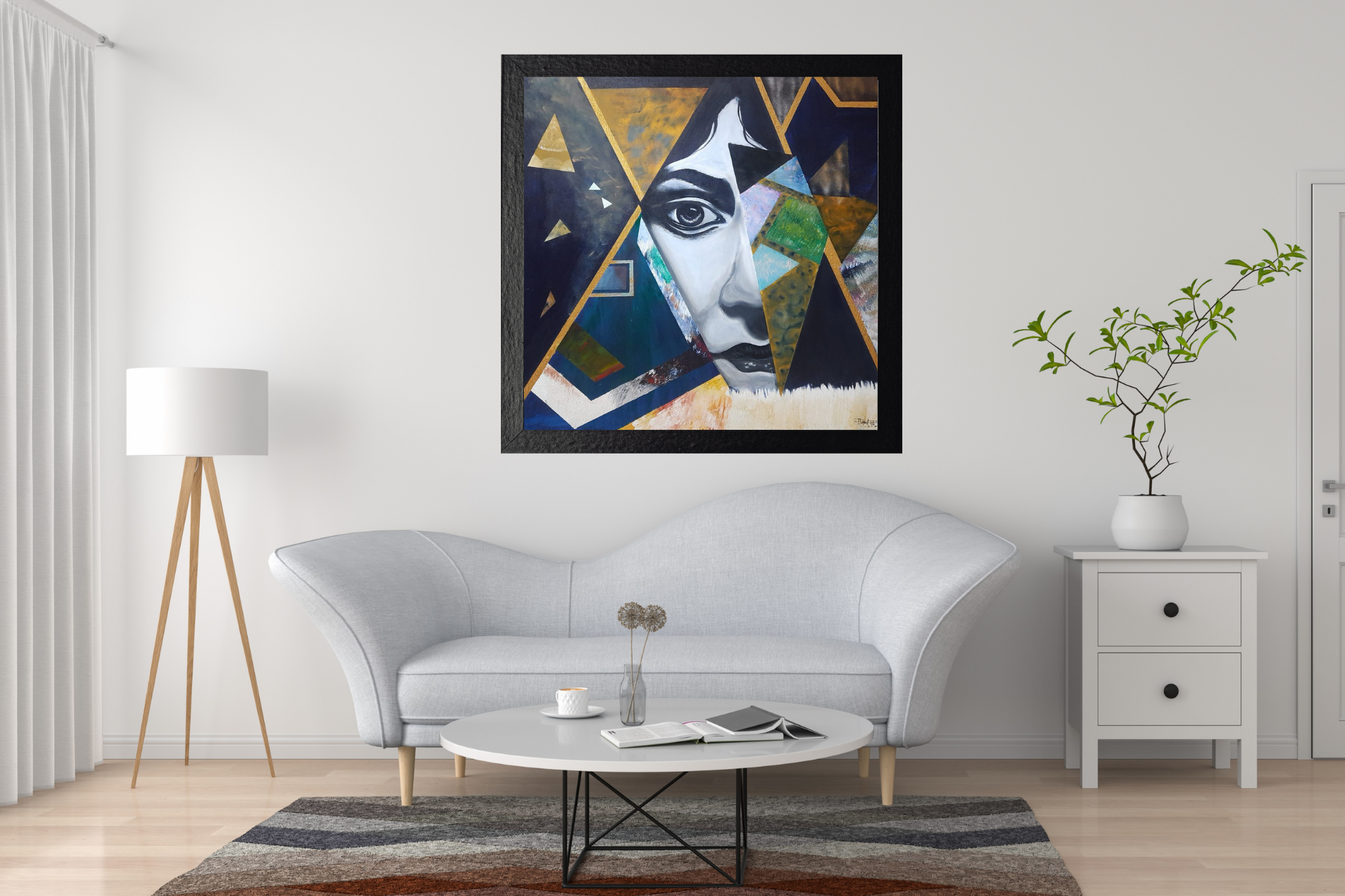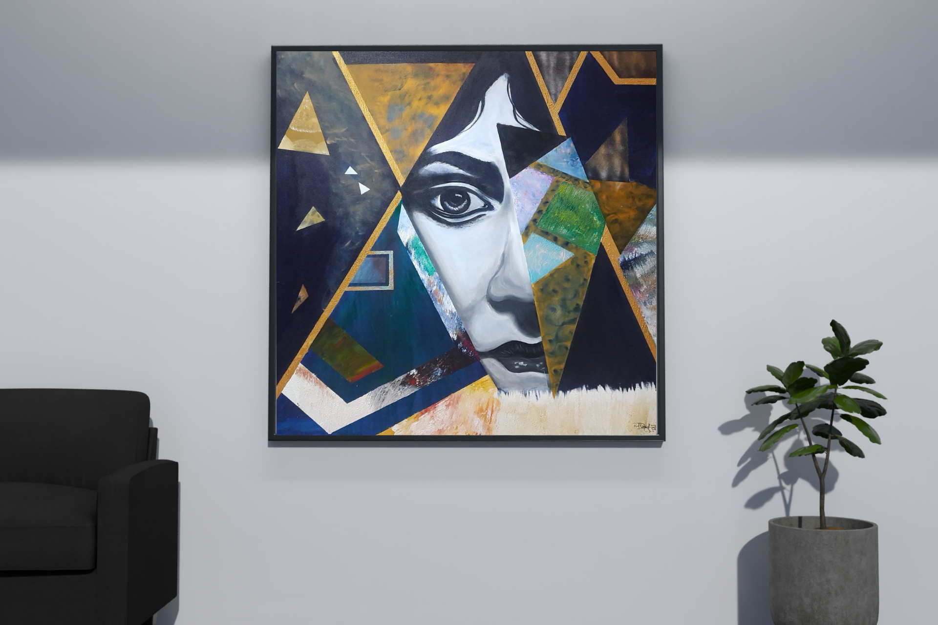 This abstract artwork is a visual exploration of the complexities of the human experience. It features a dynamic composition of triangles, which could represent various themes such as strength, change, or balance. The use of different colors and shapes suggests a range of emotions, including both pain and happiness. The piece invites the viewer to consider the interplay between these opposing feelings and how they coexist within us.